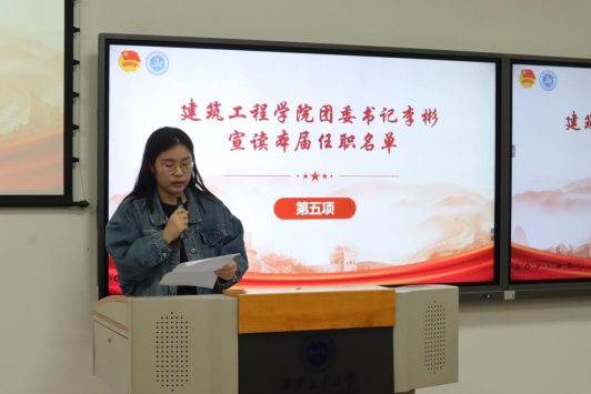 大会伊始,主持人介绍到场嘉宾,全体成员起立奏唱共青团团歌,激昂旋律拉开换届序幕。随后,秦亚敏老师宣读上届团学组织任职名单,大会进入聘书颁发环节:秦亚敏老师为上届新媒体中心、第二课堂、知心协会干部颁发聘书,李彬老师为上届团委、学生会干部颁发聘书,刘冬老师为上届科协、青协干部颁发聘书,贾建利老师为上届主席团成员颁发聘书。